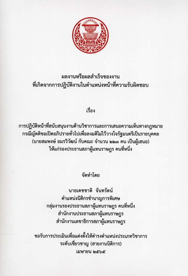 การปฏิบัติหน้าที่สนับสนุนงานด้านวิชาการและการเสนอความเห็นทางกฎหมาย กรณีญัตติขอเปิดอภิปรายทั่วไปเพื่อลงมติไม่ไว้วางใจรัฐมนตรีเป็นรายบุคคล (นายสมพงษ์ อมรวิวัฒน์ กับคณะ จำนวน 223 คน เป็นผู้เสนอ) ให้แก่รองประธานสภาผู้แทนราษฎร คนที่หนึ่ง / เดชชาติ จันทรัตน์.