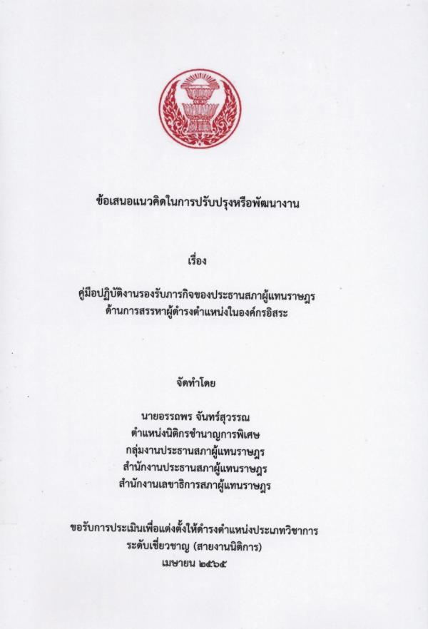 คู่มือปฏิบัติงานรองรับภารกิจของประธานสภาผู้แทนราษฎรด้านการสรรหาผู้ดำรงตำแหน่งในองค์กรอิสระ / อรรถพร จันทร์สุวรรณ.