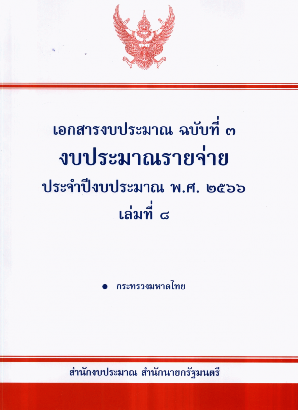 เอกสารงบประมาณ ฉบับที่ 3 งบประมาณรายจ่าย ประจำปีงบประมาณ พ.ศ. 2566 เล่มที่ 8 กระทรวงมหาดไทย / สำนักงบประมาณ.