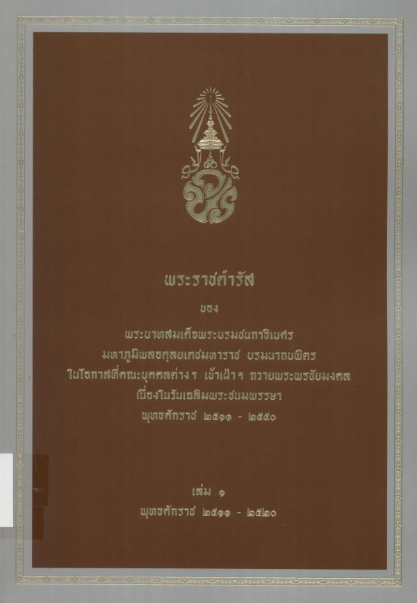 พระราชดำรัสของพระบาทสมเด็จพระบรมชนกาธิเบศร มหาภูมิพลอดุลยเดชมหาราช บรมนาถบพิตร ในโอกาสที่คณะบุคคลต่างๆ เข้าเฝ้าฯ ถวายพระพรชัยมงคล เนื่องในวันเฉลิมพระชนมพรรษา พุทธศักราช 2511 - 2550 เล่ม 1 พุทธศักราช 2511 - 2520 / กรมราชเลขานุการในพระองค์ สำนักพระราชวัง.