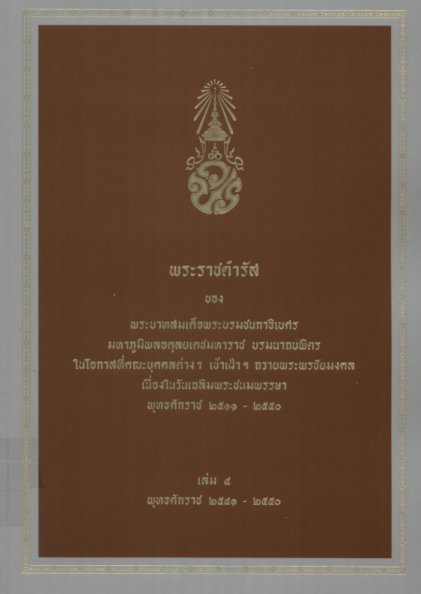 พระราชดำรัสของพระบาทสมเด็จพระบรมชนกาธิเบศร มหาภูมิพลอดุลยเดชมหาราช บรมนาถบพิตร ในโอกาสที่คณะบุคคลต่าง ๆ เข้าเฝ้าฯ ถวายพระพรชัยมงคล เนื่องในวันเฉลิมพระชนมพรรษา พุทธศักราช 2511 - 2550 เล่ม 4 พุทธศักราช 2551 - 2550 / กรมราชเลขานุการในพระองค์ สำนักพระราชวัง.