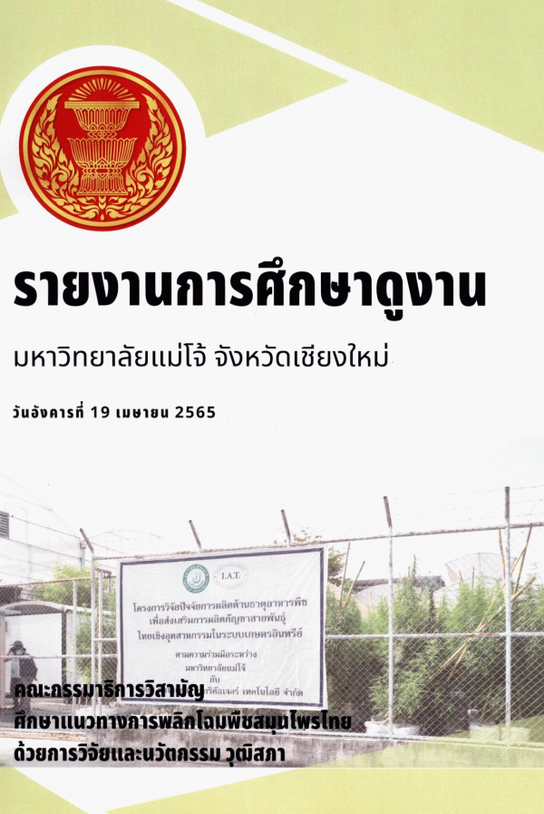 รายงานการศึกษาดูงานมหาวิทยาลัยแม่โจ้ จังหวัดเชียงใหม่ วันอังคารที่ 19 เมษายน 2565 คณะกรรมาธิการวิสามัญศึกษาแนวทางการพลิกโฉมพืชสมุนไพรไทยด้วยการวิจัยและนวัตกรรม วุฒิสภา / สำนักกรรมาธิการ 2 สำนักงานเลขาธิการวุฒิสภา.