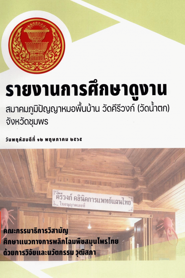 รายงานการศึกษาดูงานสมาคมภูมิปัญญาหมอพื้นบ้าน วัดคีรีวงก์ (วัดน้ำตก) อำเภอหลังสวน จังหวัดชุมพร วันพฤหัสบดีที่ 12 พฤษภาคม 2565 คณะกรรมาธิการวิสามัญศึกษาแนวทางการพลิกโฉมพืชสมุนไพรไทยด้วยการวิจัยและนวัตกรรม วุฒิสภา / สำนักกรรมาธิการ 2 สำนักงานเลขาธิการวุฒิสภา.