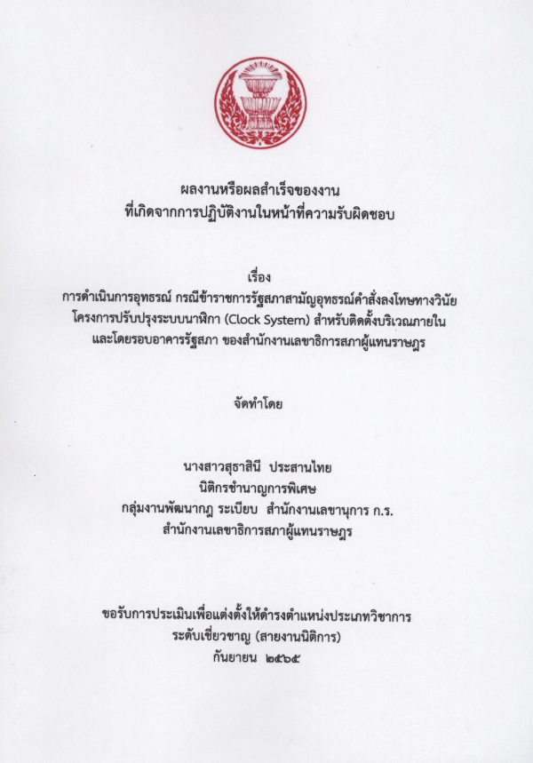 การดำเนินการอุทธรณ์ กรณีข้าราชการรัฐสภาสามัญอุทธรณ์คำสั่งลงโทษทางวินัยโครงการปรับปรุงระบบนาฬิกา (Clock System) สำหรับติดตั้งบริเวณภายในและโดยรอบอาคารรัฐสภา ของสำนักงานเลขาธิการสภาผู้แทนราษฎร / สุธาสินี ประสานไทย.