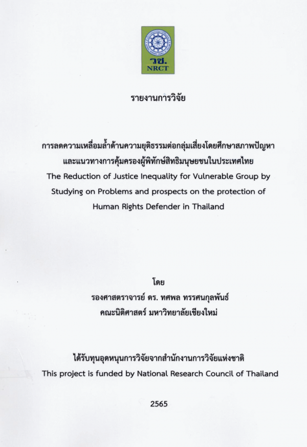 การลดความเหลื่อมล้ำด้านความยุติธรรมต่อกลุ่มเสี่ยงโดยศึกษาสภาพปัญหาและแนวทางการคุ้มครองผู้พิทักษ์สิทธิมนุษยชนในประเทศไทย = The reduction of justice inequality for vulnerable group by studying on problems and prospects on the protection of human rights defender in Thailand / ทศพล ทรรศนกุลพันธ์.