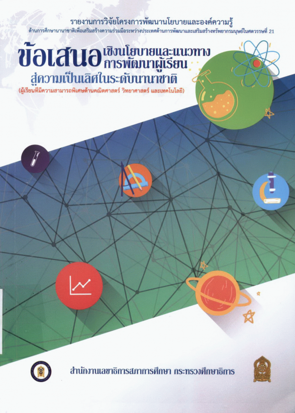 - ข้อเสนอเชิงนโยบายและแนวทางการพัฒนาผู้เรียนสู่ความเป็นเลิศในระดับนานาชาติ (ผู้เรียนที่มีความสามารถพิเศษด้านคณิตศาสตร์ วิทยาศาสตร์ และเทคโนโลยี) [Spine title]