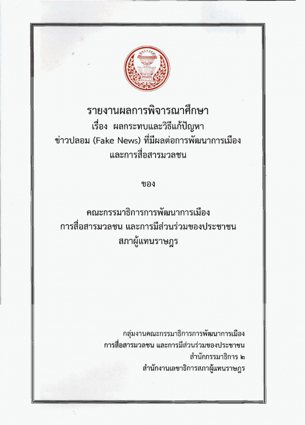 รายงานผลการพิจารณาศึกษา เรื่อง ผลกระทบและวิธีแก้ปัญหาข่าวปลอม (Fake News) ที่มีผลต่อการพัฒนาการเมืองและการสื่อสารมวลชน ของคณะกรรมาธิการการพัฒนาการเมือง การสื่อสารมวลชน และการมีส่วนร่วมของประชาชน สภาผู้แทนราษฎร / กลุ่มงานคณะกรรมาธิการการพัฒนาการเมือง การสื่อสารมวลชน และการมีส่วนร่วมของประชาชน สำนักกรรมาธิการ 2 สำนักงานเลขาธิการสภาผู้แทนราษฎร.
