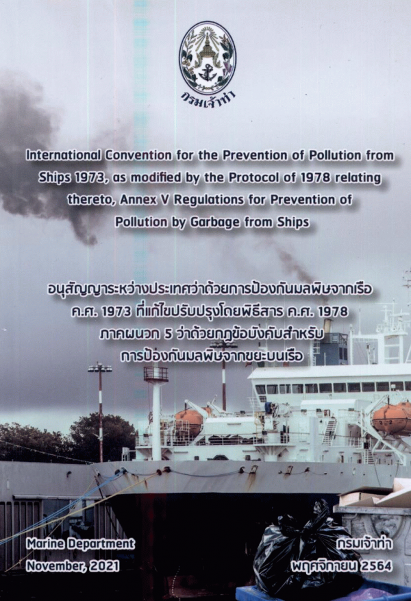 อนุสัญญาระหว่างประเทศว่าด้วยการป้องกันมลพิษจากเรือ ค.ศ. 1973 ที่แก้ไขปรับปรุงโดยพิธีสาร ค.ศ. 1978 ภาคผนวก 5 ว่าด้วยกฎข้อบังคับสำหรับการป้องกันมลพิษจากขยะบนเรือ = International Convention for the Prevention of Pollution from Ships 1973, as modified by the Protocol of 1978 relating thereto, Annex V Regulations for Prevention of Pollution by Garbage from Ships / กรมเจ้าท่า.