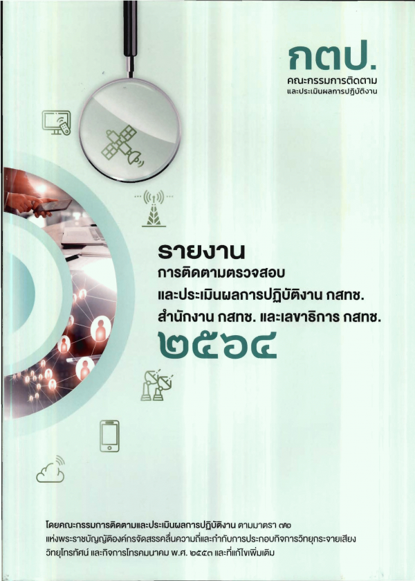 รายงานการติดตามตรวจสอบ และประเมินผลการปฏิบัติงาน กสทช. สำนักงาน กสทช. และเลขาธิการ กสทช. ประจำปี 2564 โดยคณะกรรมการติดตามและประเมินผลการปฏิบัติงาน ตามมาตรา 72 แห่งพระราชบัญญัติองค์กรจัดสรรคลื่นความถี่และกำกับการประกอบกิจการวิทยุกระจายเสียง วิทยุโทรทัศน์ และกิจการโทรคมนาคม พ.ศ. 2553 และที่แก้ไขเพิ่มเติม / สำนักงานคณะกรรมการกิจการกระจายเสียง กิจการโทรทัศน์ และกิจการโทรคมนาคมแห่งชาติ (สำนักงาน กสทช.)..