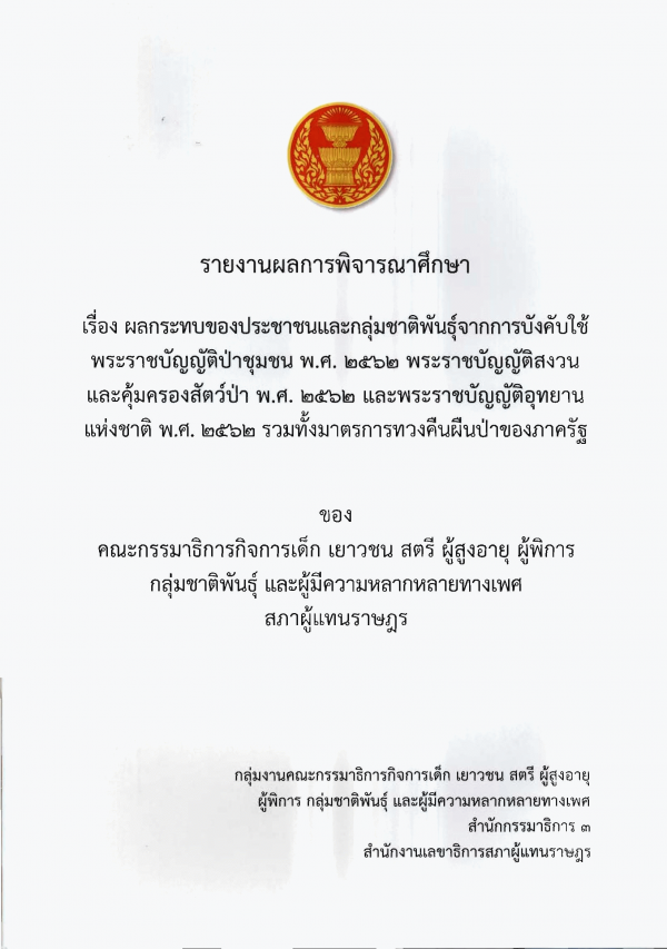 รายงานผลการพิจารณาศึกษา เรื่อง ผลกระทบของประชาชนและกลุ่มชาติพันธุ์จากการบังคับใช้พระราชบัญญัติป่าชุมชน พ.ศ. 2562 พระราชบัญญัติสงวนและคุ้มครองสัตว์ป่า พ.ศ. 2562 และพระราชบัญญัติอุทยานแห่งชาติ พ.ศ. 2562 รวมทั้งมาตรการทวงคืนผืนป่าของภาครัฐ ของคณะกรรมาธิการกิจการเด็ก เยาวชน สตรี ผู้สูงอายุ ผู้พิการ กลุ่มชาติพันธุ์ และผู้มีความหลากหลายทางเพศ สภาผู้แทนราษฎร/ กลุ่มงานคณะกรรมาธิการกิจการเด็ก เยาวชน สตรี ผู้สูงอายุ ผู้พิการ กลุ่มชาติพันธุ์ และผู้มีความหลากหลายทางเพศ สำนักกรรมาธิการ 3 สำนักงานเลขาธิการสภาผู้แทนราษฎร.