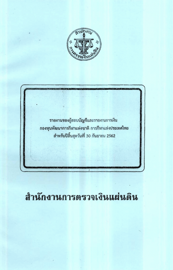 รายงานของผู้สอบบัญชีและรายงานการเงินกองทุนพัฒนาการกีฬาแห่งชาติ การกีฬาแห่งประเทศไทย สำหรับปีสิ้นสุดวันที่ 30 กันยายน 2562 / สำนักงานการตรวจเงินแผ่นดิน.