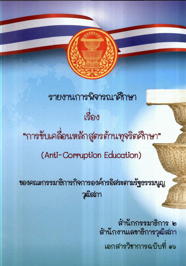 รายงานการพิจารณาศึกษา เรื่อง "การขับเคลื่อนหลักสูตรต้านทุจริตศึกษา" (Anti-Corruption Education) ของ คณะกรรมาธิการกิจการองค์กรอิสระตามรัฐธรรมนูญ วุฒิสภา / คณะกรรมาธิการกิจการองค์กรอิสระตามรัฐธรรมนูญ สำนักกรรมาธิการ 2 สำนักงานเลขาธิการวุฒิสภา.
