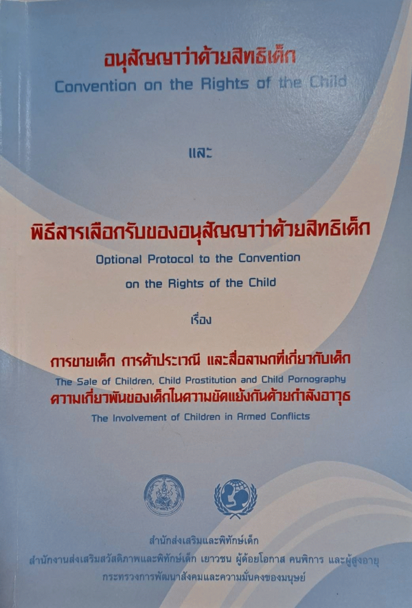 อนุสัญญาว่าด้วยสิทธิเด็ก ; และ พิธีสารเลือกรับของอนุสัญญาว่าด้วยสิทธิเด็ก เรื่อง การขายเด็ก การค้าประเวณี และสื่อลามกที่เกี่ยวกับเด็ก, [เรื่อง] ความเกี่ยวพันของเด็กในความขัดแย้งกันด้วยอาวุธ = Convention on the rights of the child ; [and] Optional protocol to the convention on the rights of the child [title] the sale of children, child prostitution and child pornography, [title] the involvement of children in armed conflicts / ผู้แต่ง คณะกรรมาธิการด้านสิทธิมนุษยชน องค์การสหประชาติ ; ผู้แปล กระทรวงการต่างประเทศ, วันชัย รุจนวงศ์ และคณะ.