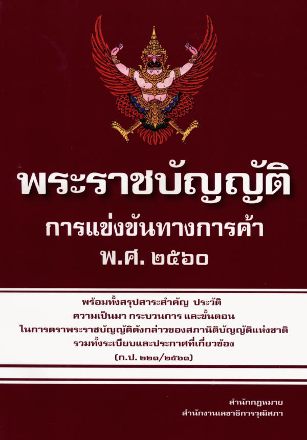 พระราชบัญญัติการแข่งขันทางการค้า พ.ศ. 2560 พร้อมทั้งสรุปสาระสำคัญ ประวัติ ความเป็นมา กระบวนการและขั้นตอนในการตราพระราชบัญญัติดังกล่าวของสภานิติบัญญัติแห่งชาติ รวมทั้งระเบียบและประกาศที่เกี่ยวข้อง / กลุ่มงานพัฒนากฎหมาย สำนักกฎหมาย สำนักงานเลขาธิการวุฒิสภา.