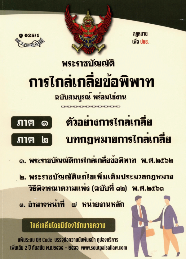 ปรารภ คลิปคำอธิบาย -- ภาค 1 1. คำอธิบายการไกล่เกลี่ย และคลิปข่าวการยิงทนายหน้าศาล -- ภาค 2 พระราชบัญญัติการไกล่เกลี่ยข้อพิพาท พ.ศ. 2562 -- กฎหมายการไกล่เกลี่ยข้อพิพาท แปลไทย-อังกฤษ (ในQR Code) -- พระราชบัญญัติแก้ไขเพิ่มเติมประมวลกฎหมาย -- วิธีพิจารณาความแพ่ง (ฉบับที่ 32 ) พ.ศ. 2563 -- อำนาจหน้าที่ -- ประธานศาลฎีกา -- นายกรัฐมนตรี -- รัฐมนตรีว่าการกระทรวงกลาโหม -- รัฐมนตรีว่าการกระทรวงมหาดไทย -- รัฐมนตรีว่าการกระทรวงยุติธรรม -- อัยการสูงสุด -- ศาลปกครอง -- ประกาศนายทะเบียน -- ดัชนี.
