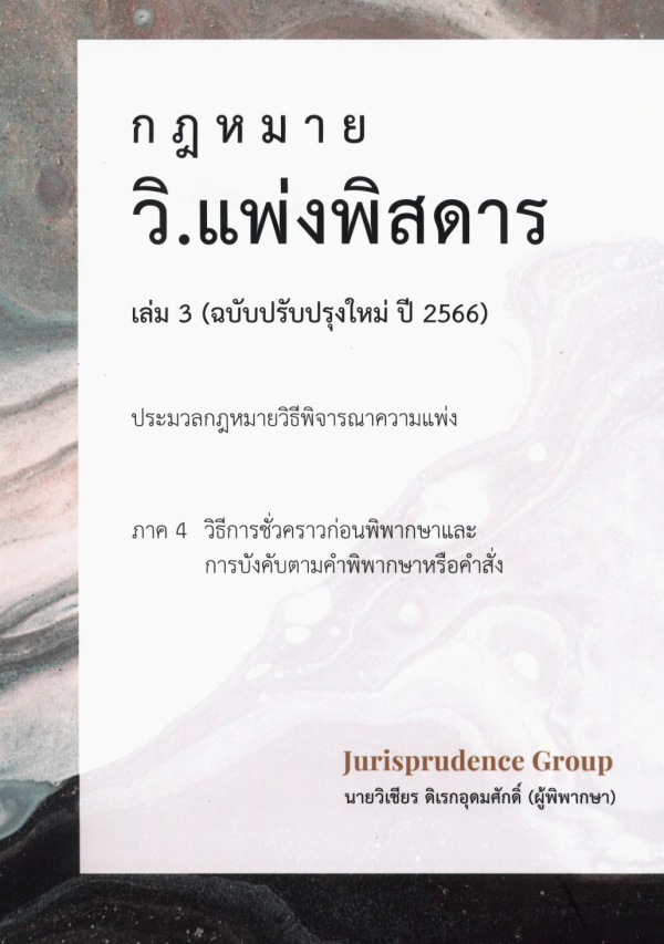 - กฎหมาย วิ.แพ่งพิสดาร เล่ม 3 (ฉบับปรับปรุงใหม่ ปี 2566) ประมวลกฎหมายวิธีพิจารณาความแพ่ง ภาค 4 วิธีการชั่วคราวก่อนพิพากษาและการบังคับตามคำพิพากษาหรือคำสั่ง [Cover title]