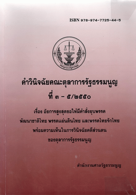 คำวินิจฉัยคณะตุลาการรัฐธรรมนูญที่ 3-5/2550 เรื่อง อัยการสูงสุดขอให้มีคำสั่งยุบพรรคพัฒนาชาติไทย พรรคแผ่นดินไทย และพรรคไทยรักไทย พร้อมความเห็นในการวินิจฉัยคดีส่วนตนของตุลาการรัฐธรรมนูญ / สำนักงานศาลรัฐธรรมนูญ.