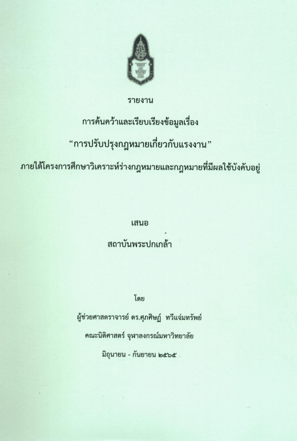 "การปรับปรุงกฎหมายเกี่ยวกับแรงงาน" ภายใต้โครงการศึกษาวิเคราะห์ร่างกฎหมายและกฎหมายที่มีผลใช้บังคับอยู่ / ศุภศิษฏ์ ทวีแจ่มทรัพย์.