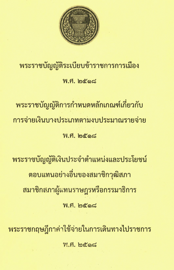 พระราชบัญญัติระเบียบข้าราชการการเมือง พ.ศ. 2518 พระราชบัญญัติการกำหนดหลักเกณฑ์เกี่ยวกับการจ่ายเงินบางประเภทตามงบประมาณรายจ่าย พ.ศ. 2518 พระราชบัญญัติเงินประจำตำแหน่งและประโยชน์ตอบแทนอย่างอื่นของสมาชิกวุฒิสภา สมาชิกสภาผู้แทนราษฎรหรือกรรมาธิการ พ.ศ. 2518 พระราชกฤษฎีกาค่าใช้จ่ายในการเดินทางไปราชการ พ.ศ. 2518