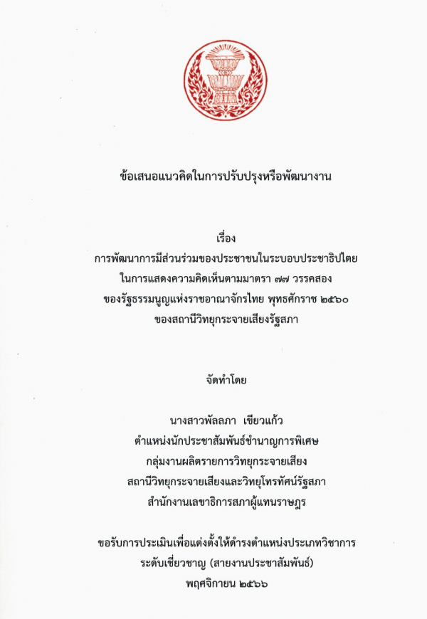 TextPublisher: กรุงเทพฯ : สำนักงานเลขาธิการสภาผู้แทนราษฎร, 2565.Description: 78 หน้า : ภาพประกอบ, ตาราง ; 29 ซมOther title: - ข้อเสนอแนวคิดในการปรับปรุงหรือพัฒนางาน