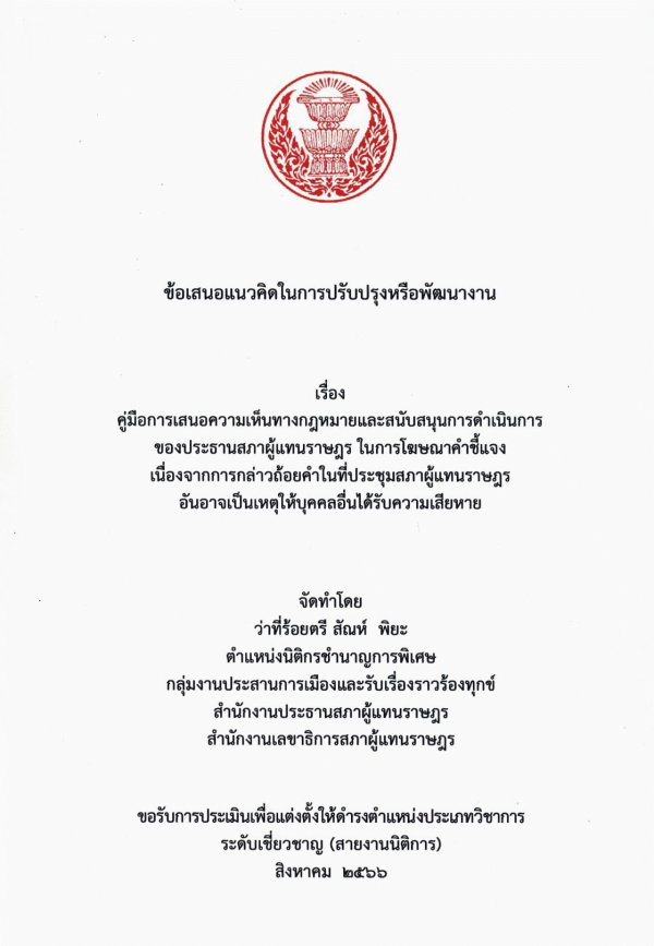 คู่มือการเสนอความเห็นทางกฎหมายและสนับสนุนการดำเนินการของประธานสภาผู้แทนราษฎร ในการโฆษณาคำชี้แจงเนื่องจากการกล่าวถ้อยคำในที่ประชุมสภาผู้แทนราษฎร อันอาจเป็นเหตุให้บุคคลอื่นได้รับความเสียหาย / สันห์ พิยะ.