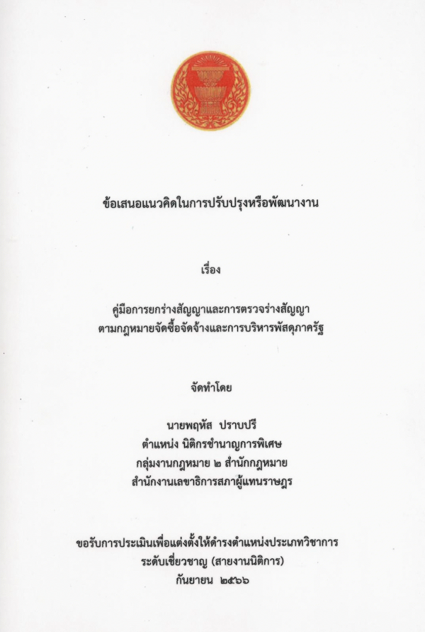 คู่มือการยกร่างสัญญาและการตรวจร่างสัญญาตามกฎหมายจัดซื้อจัดจ้างและการบริหารพัสดุภาครัฐ / พฤหัส ปราบปรี.