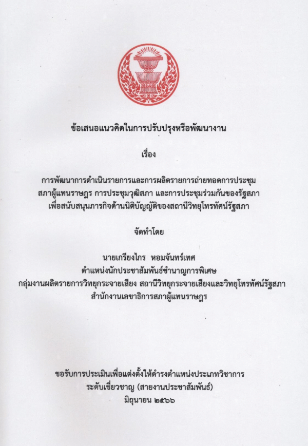 การพัฒนาการดำเนินรายการและการผลิตรายการถ่ายทอดการประชุมสภาผู้แทนราษฎร การประชุมวุฒิสภา และการประชุมร่วมกันของรัฐสภา เพื่อสนับสนุนภารกิจด้านนิติบัญญัติของสถานีวิทยุโทรทัศน์รัฐสภา / เกรียงไกร หอมจันทร์เทศ.