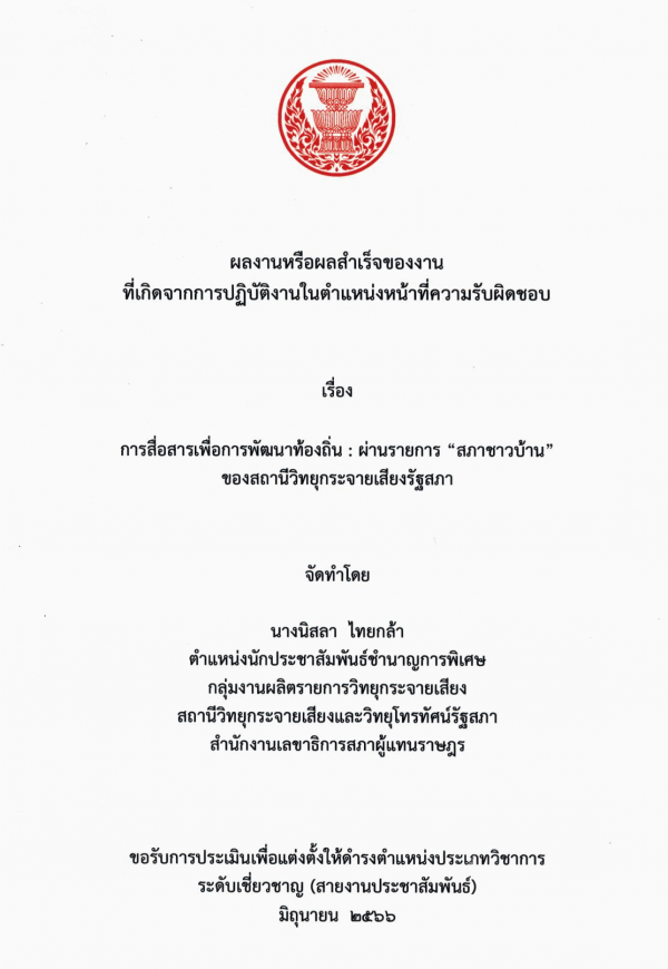 การสื่อสารเพื่อการพัฒนาท้องถิ่น : ผ่านรายการ "สภาชาวบ้าน" ของสถานีวิทยุกระจายเสียงรัฐสภา / นิสลา ไทยกล้า.
