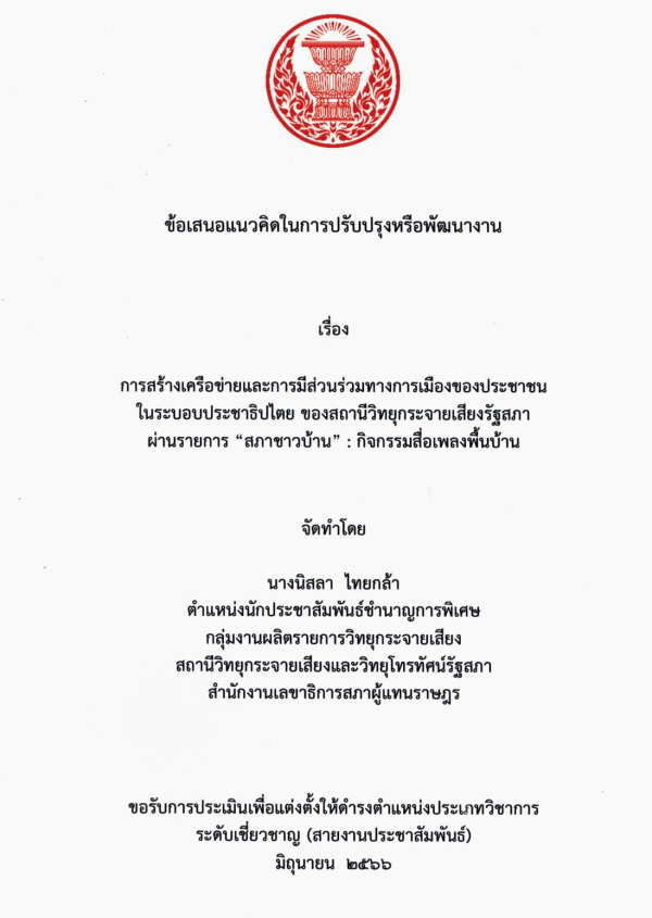 การสร้างเครือข่ายและการมีส่วนร่วมทางการเมืองของประชาชนในระบอบประชาธิปไตยของสถานีวิทยุกระจายเสียงรัฐสภา ผ่านรายการ "สภาชาวบ้าน" : กิจกรรมสื่อเพลงพื้นบ้าน / นิสลา ไทยกล้า.