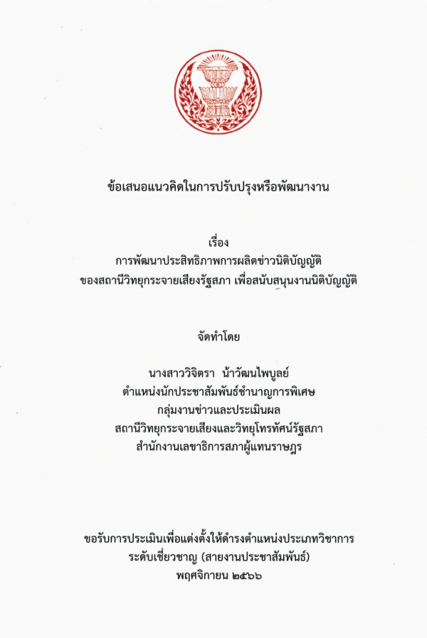 การพัฒนาประสิทธิภาพการผลิตข่าวนิติบัญญัติของสถานีวิทยุกระจายเสียงรัฐสภา เพื่อสนับสนุนงานนิติบัญญัติ / วิจิตรา น้าวัฒนไพบูลย์.