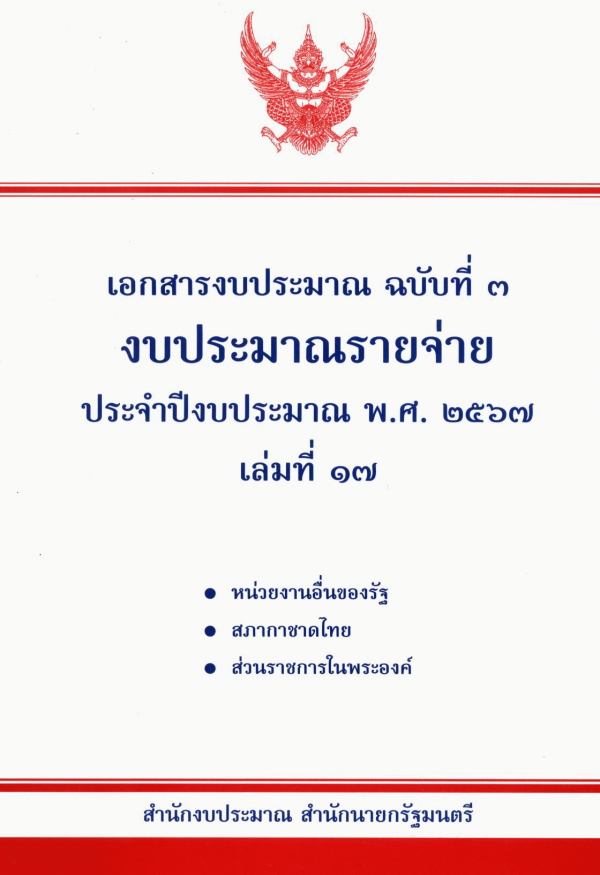 เอกสารงบประมาณ ฉบับที่ 3 งบประมาณรายจ่าย ประจำปีงบประมาณ พ.ศ. 2567 เล่มที่ 17 หน่วยงานอื่นของรัฐ สภากาชาดไทย ส่วนราชการในพระองค์ / สำนักงบประมาณ.