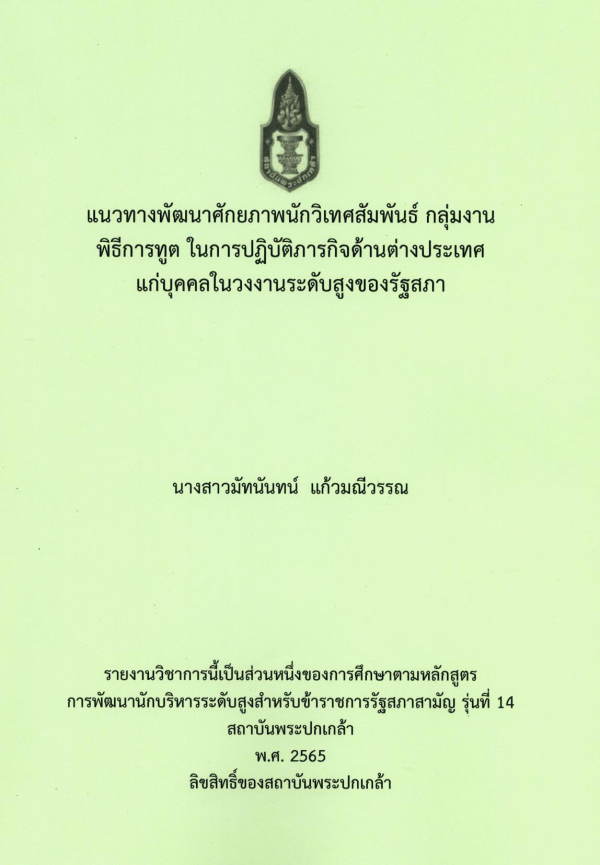 แนวทางพัฒนาศักยภาพนักวิเทศสัมพันธ์ กลุ่มงานพิธีการทูต ในการปฏิบัติภารกิจด้านต่างประเทศแก่บุคคลในวงงานระดับสูงของรัฐสภา / มัทนันทน์ แก้วมณีวรรณ ; สถาบันพระปกเกล้า.