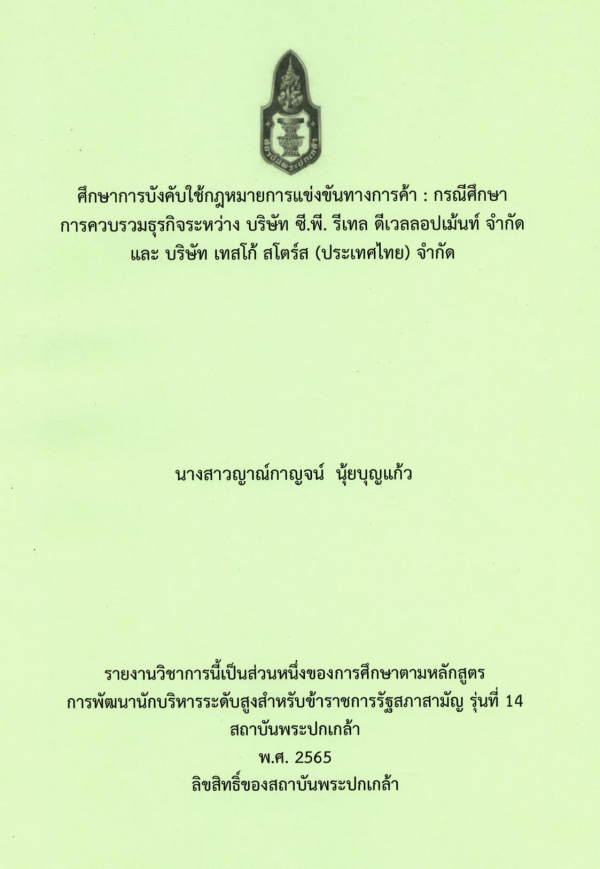 ศึกษาการบังคับใช้กฎหมายการแข่งขันทางการค้า : กรณีศึกษา การควบรวมธุรกิจระหว่าง บริษัท ซี.พี. รีเทล ดีเวลลอปเม้นท์ จำกัด และ บริษัท เทสโก้ สโตร์ส (ประเทศไทย) จำกัด / ญาณ์กาญจน์ นุ้ยบุญแก้ว ; สถาบันพระปกเกล้า.