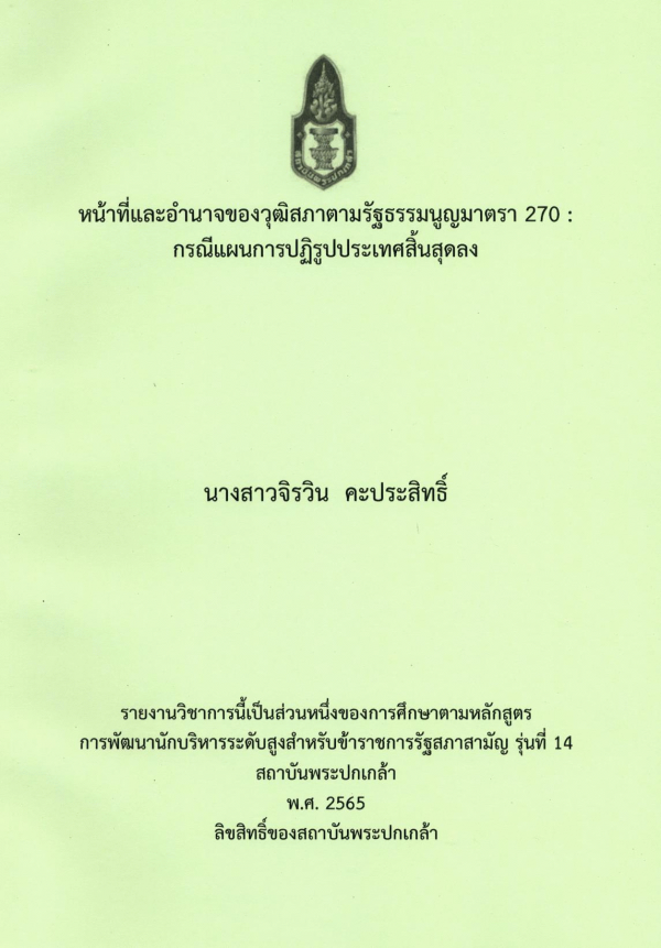 หน้าที่และอำนาจของวุฒิสภาตามรัฐธรรมนูญมาตรา 270 : กรณีแผนการปฏิรูปประเทศสิ้นสุดลง / จิรวิน คะประสิทธิ์ ; สถาบันพระปกเกล้า.