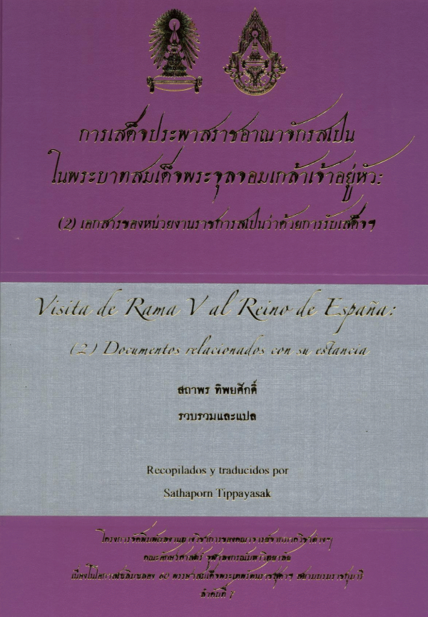 การเสด็จประพาสราชอาณาจักรสเปนในพระบาทสมเด็จพระจุลจอมเกล้าเจ้าอยู่หัว : (2) เอกสารของหน่วยงานราชการสเปนว่าด้วยการรับเสด็จฯ = Visita de Rama V al Reino de Espana : (2) documentos relacionados con su estancia / สถาพร ทิพยศักดิ์, รวบรวมและแปล ; กาญจนา ศรีอังกูร บุนนาค, บรรณาธิการ.
