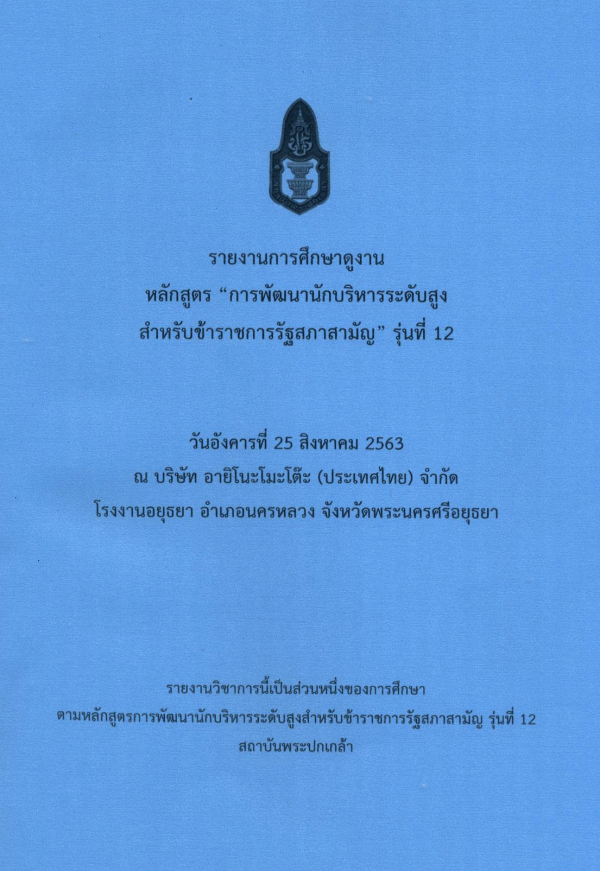 รายงานการศึกษาดูงานหลักสูตร "การพัฒนานักบริหารระดับสูงสำหรับข้าราชการรัฐสภาสามัญ" รุ่นที่ 12 วันอังคารที่ 25 สิงหาคม 2563 ณ บริษัท อายิโนะโมะโต๊ะ (ประเทศไทย) จำกัด โรงงานอยุธยา อำเภอนครหลวง จังหวัดพระนครศรีอยุธยา / สถาบันพระปกเกล้า.