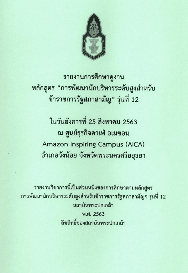 รายงานการศึกษาดูงานหลักสูตร "การพัฒนานักบริหารระดับสูงสำหรับข้าราชการรัฐสภาสามัญ" รุ่นที่ 12 ในวันอังคารที่ 25 สิงหาคม 2563 ณ ศูนย์ธุรกิจคาเฟ่ อเมซอน Amazon Inspiring Campus (AICA) อำเภอวังน้อย จังหวัดพระนครศรีอยุธยา / สถาบันพระปกเกล้า.