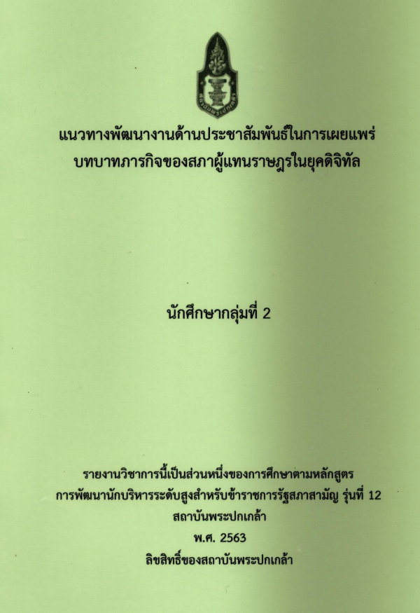 แนวทางพัฒนางานด้านประชาสัมพันธ์ในการเผยแพร่บทบาทภารกิจของสภาผู้แทนราษฎรในยุคดิจิทัล / นักศึกษาสถาบันพระปกเกล้า หลักสูตรการพัฒนานักบริหารระดับสูง สำหรับข้าราชการรัฐสภาสามัญ รุ่นที่ 12 กลุ่มที่ 2 ; สถาบันพระปกเกล้า.
