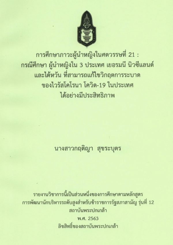 การศึกษาภาวะผู้นำหญิงในศตวรรษที่ 21 : กรณีศึกษา ผู้นำหญิงใน 3 ประเทศ เยอรมนี นิวซีแลนด์ และไต้หวัน ที่สามารถแก้ไขวิกฤตการระบาดของไวรัสโคโรนา โควิด-19 ในประเทศได้อย่างมีประสิทธิภาพ / กฤติญา สุขระบุตร ; สถาบันพระปกเกล้า.