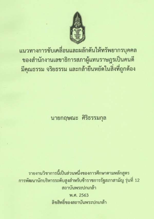 แนวทางการขับเคลื่อนและผลักดันให้ทรัพยากรบุคคลของสำนักงานเลขาธิการสภาผู้แทนราษฎรเป็นคนดี มีคุณธรรม จริยธรรม และกล้ายืนหยัดในสิ่งที่ถูกต้อง / กฤษณะ ศิริธรรมกุล ; สถาบันพระปกเกล้า.