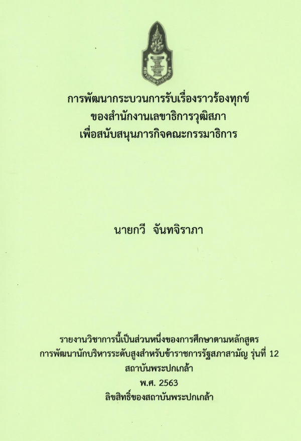 การพัฒนากระบวนการรับเรื่องราวร้องทุกข์ของสำนักงานเลขาธิการวุฒิสภาเพื่อสนับสนุนภารกิจคณะกรรมาธิการ / กวี จันทจิราภา ; สถาบันพระปกเกล้า.