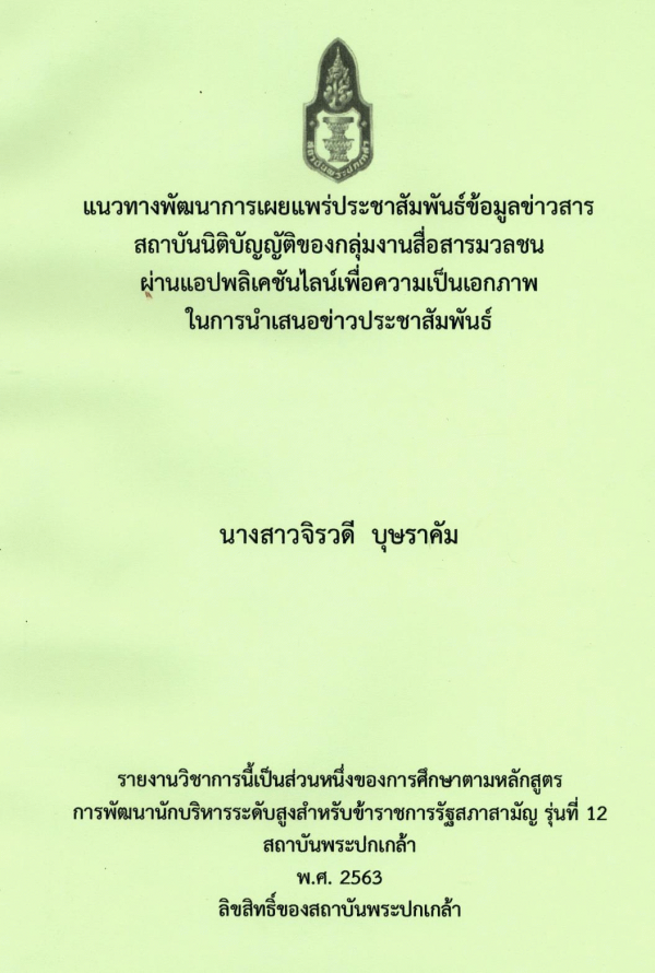 แนวทางพัฒนาการเผยแพร่ประชาสัมพันธ์ข้อมูลข่าวสารสถาบันนิติบัญญัติของกลุ่มงานสื่อสารมวลชนผ่านแอปพลิเคชันเพื่อความเป็นเอกภาพในการนำเสนอข่าวประชาสัมพันธ์ / จิรวดี บุษราคัม ; สถาบันพระปกเกล้า.
