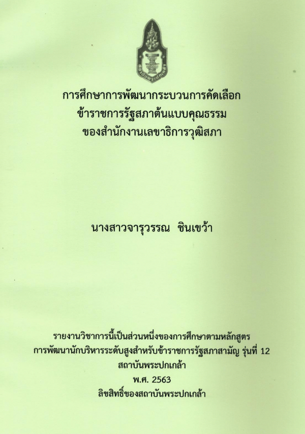 การศึกษาการพัฒนากระบวนการคัดเลือกข้าราชการรัฐสภาต้นแบบคุณธรรมของสำนักงานเลขาธิการวุฒิสภา / จารุวรรณ ชินเขว้า ; สถาบันพระปกเกล้า.
