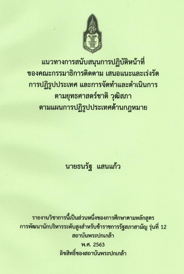แนวทางการสนับสนุนการปฏิบัติหน้าที่ของคณะกรรมาธิการติดตาม เสนอแนะและเร่งรัดการปฏิรูปประเทศ และการจัดทำและดำเนินการตามยุทธศาสตร์ชาติ วุฒิสภา ตามแผนการปฏิรูปประเทศด้านกฎหมาย / ธนรัฐ แสนแก้ว ; สถาบันพระปกเกล้า.