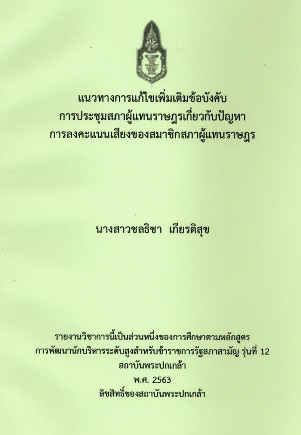 แนวทางการแก้ไขเพิ่มเติมข้อบังคับการประชุมสภาผู้แทนราษฎรเกี่ยวกับปัญหาการลงคะแนนเสียงของสมาชิกสภาผู้แทนราษฎร / ชลธิชา เกียรติสุข ; สถาบันพระปกเกล้า.