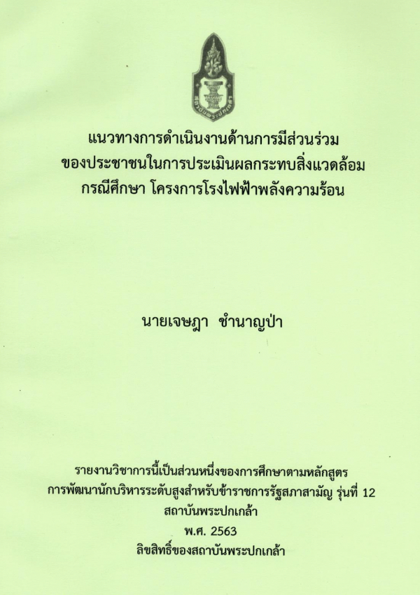 แนวทางการดำเนินงานด้านการมีส่วนร่วมของประชาชนในการประเมินผลกระทบสิ่งแวดล้อม กรณีศึกษา โครงการโรงไฟฟ้าพลังความร้อน / เจษฎา ชำนาญป่า ; สถาบันพระปกเกล้า.