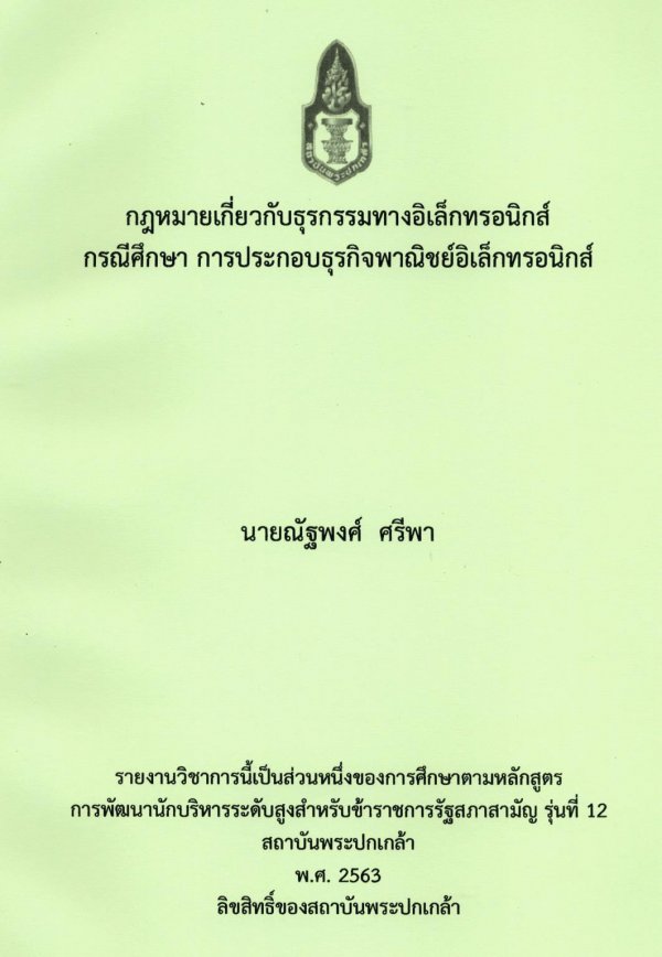 กฎหมายเกี่ยวกับธุรกรรมทางอิเล็กทรอนิกส์ กรณีศึกษา การประกอบธุรกิจพาณิชย์อิเล็กทรอนิกส์ / ณัฐพงศ์ ศรีพา ; สถาบันพระปกเกล้า.