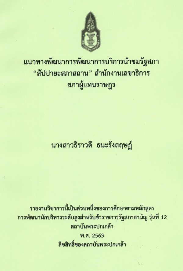 แนวทางพัฒนาการพัฒนาการบริการนำชมรัฐสภา "สัปปายะสภาสถาน" สำนักงานเลขาธิการสภาผู้แทนราษฎร / ธิราวดี ธนะรังสฤษฏ์ ; สถาบันพระปกเกล้า.