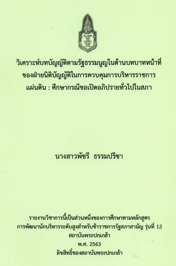 วิเคราะห์บทบัญญัติตามรัฐธรรมนูญในด้านบทบาทหน้าที่ของฝ่ายนิติบัญญัติในการควบคุมการบริหารราชการแผ่นดิน : ศึกษากรณีขอเปิดอภิปรายทั่วไปในสภา / พัชรี ธรรมปรีชา ; สถาบันพระปกเกล้า.