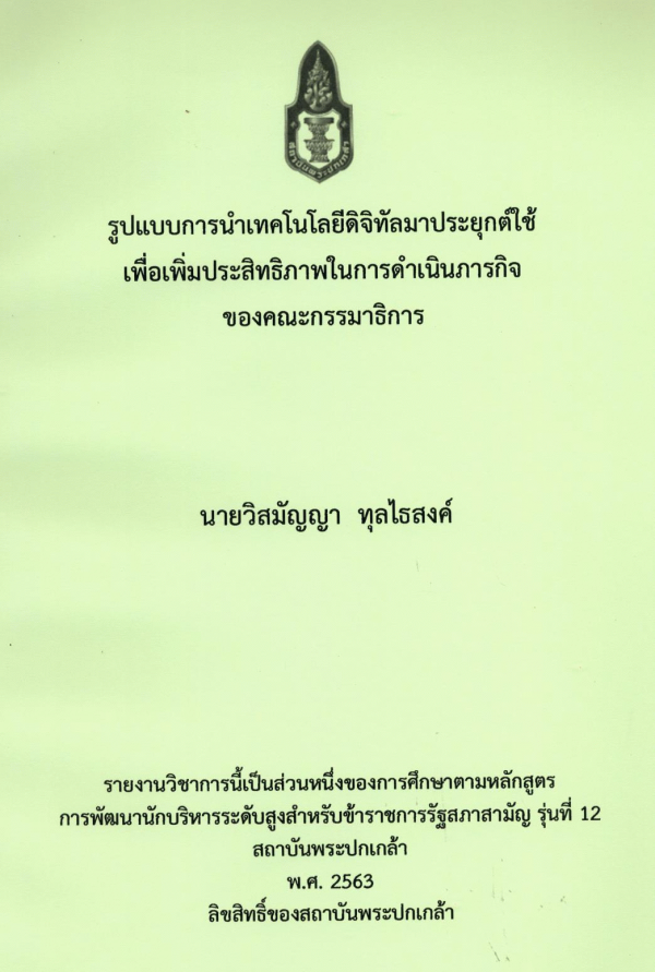 รูปแบบการนำเทคโนโลยีดิจิทัลมาประยุกต์ใช้เพื่อเพิ่มประสิทธิภาพในการดำเนินภารกิจของคณะกรรมาธิการ / วิสมัญญา ทุลไธสงค์ ; สถาบันพระปกเกล้า.